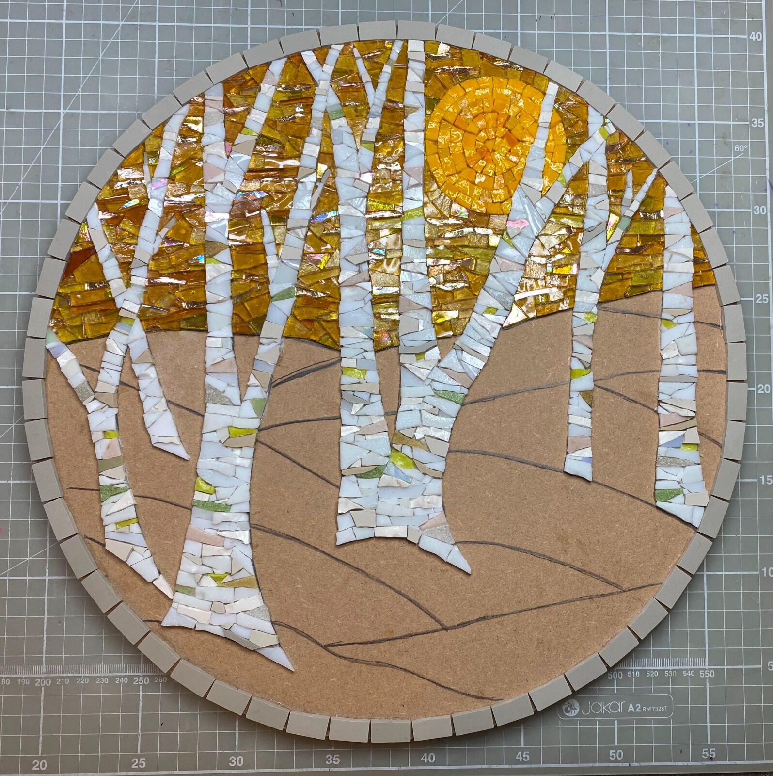 Silver birch trees sunset by mosaic artist Sue Kershaw - work in progress for RHS Harlow Carr mosaic exhibition April 2026